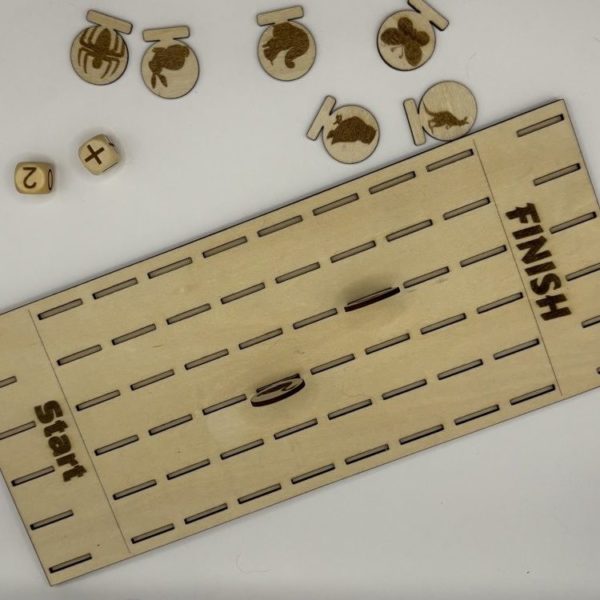 Comes with two dice, one with plus and minus on it for movement direction to the finish line and the other has 0,1,2 for how many slots to move.