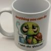White mug with cute turtle with large eyes and a steaming hot drink with the words