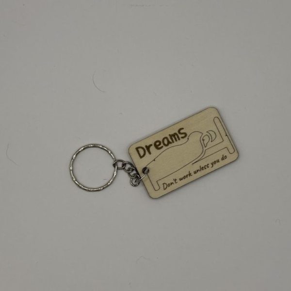 Key chain with a wooden tag and the words