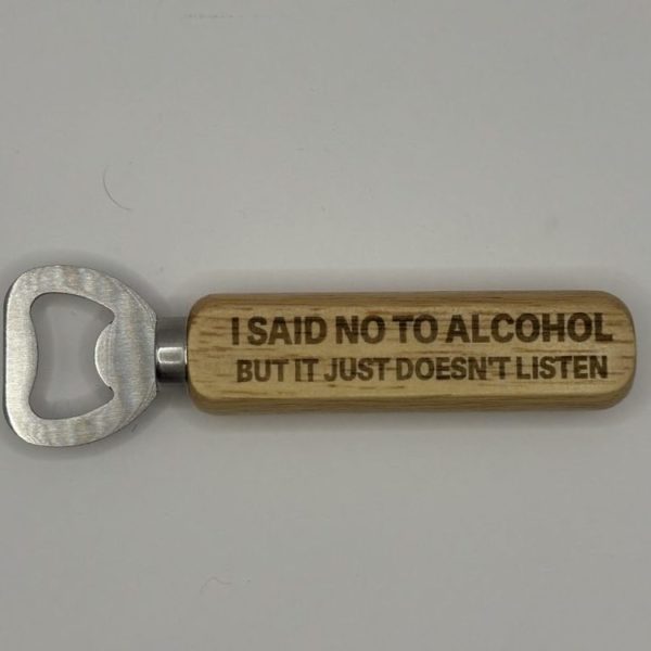 Wooden handled bottle opener engraved with